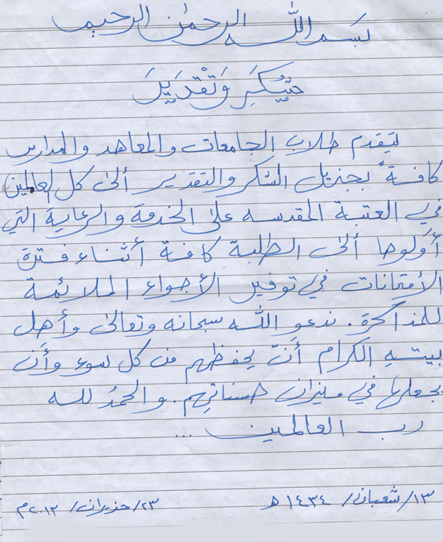 انطلاقاً من شعورها بالمسؤولية تجاه الطلبة الاعزاء ونظراً لمعاناتهم في فصل الصيف الذي يتزامن مع فترة الامتحانات، عملت الأمانة العامة للعتبة الكاظمية المقدسة على رعاية هؤلاء الطلبة وتقديم الخدمات اللازمة لخلق جو دراسي من خلال توفير مكان ملائم لمذاكرتهم ومراجعة دروسهم في صحن التوسعة، فقد تقدمت مجموعة من هؤلاء الطلبة بورقة عبروا فيها عن شكرهم وتقديرهم الى أسرة خدمة العتبة الكاظمية المقدسة التي دأبت على توفير كل ما يحتاجه الطلبة الدارسون خلال تلك الفترة وضمنوا فيها أسمائهم وتواقيعهم.