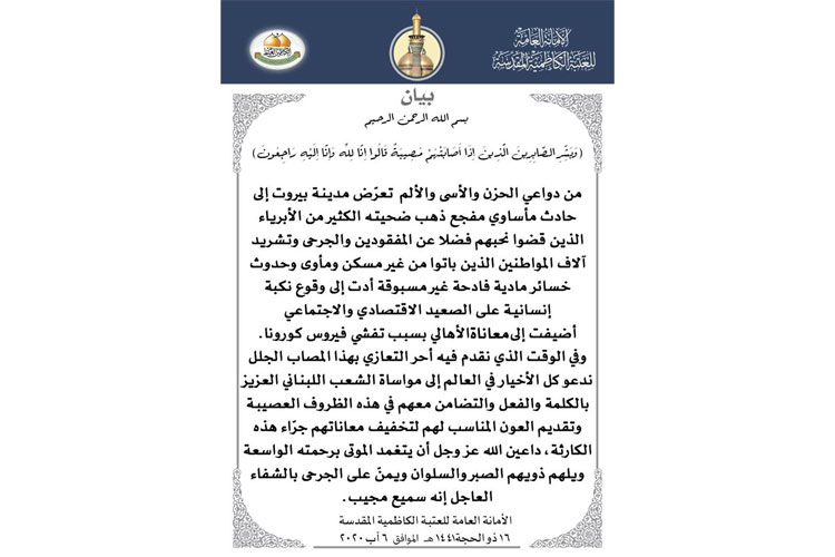 من دواعي الحزن والأسى والألم تعرّض مدينة بيروت إلى حادث مأساوي مفجع ذهب ضحيته الكثير من الأبرياء الذين قضوا نحبهم فضلا عن المفقودين والجرحى وتشريد آلاف المواطنين الذين باتوا من غير مسكن ومأوى وحدوث خسائر مادية فادحة غير مسبوقة أدت إلى وقوع نكبة إنسانية على الصعيد الاقتصادي والاجتماعي أضيفت إلى معناة الأهالي بسبب تفشي فيروس كورونا.