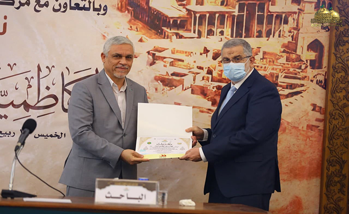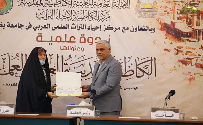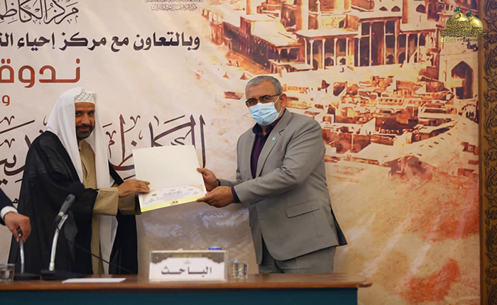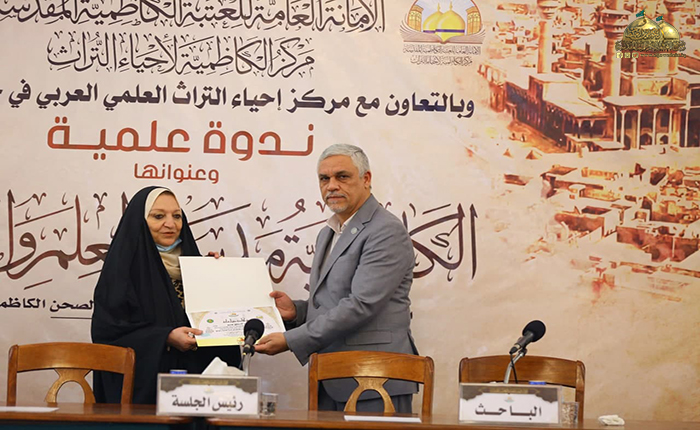 بعدها بدأت الجلسة البحثية حيث استعرضت الأستاذ مساعد دكتور زينب كامل كريم في مركز إحياء التراث العلمي العربي/ جامعة بغداد ورقة بحثية بعنوان: (الأستاذ ناجي محفوظ وجهوده في إحياء التراث)، تلتها ورقة بحثية للباحث والمحقق المهندس عبد الكريم الدباغ بعنوان: ( المدرسة الحيدرية ودورها الفكري والثقافي في مدينة الكاظمية المقدسة)، بعدها قدّم الأستاذ مساعد دكتور أحمد عبد الواحد الحلفي مركز إحياء التراث العلمي العربي/ جامعة بغداد بحثه بعنوان: (الرحالة والمستشرقون ودورهم في إحياء تراث المشهد الكاظمي)، ثم استعرض خادم العتبة المقدسة في مركز إحياء التراث الباحث محمد حسن فيصل ورقة بحثية بعنوان: (قراءة في أرشيف الدكتور حسين علي محفوظ الخاص بمركز الكاظمية لإحياء التراث/ الدراسات التراثية المخطوطة أنموذجاً)، ثم قدّم الأستاذ الدكتور سعدي إبراهيم الدراجي في مركز إحياء التراث العلمي العربي/ جامعة بغداد ورقة بحثية بعنوان: (شاهد قبر معتمد الدولة القاجارية فرهاد ميرزا (ت 1305 هـ) في العتبة الكاظمية المقدسة ـ دراسة أثرية فنية)، وكانت هناك مشاركة لخادم العتبة الكاظمية المقدسة فضيلة الشيخ منير الكاظمي بورقة بحثية بعنوان: (آثار كاظمية في حفظ التراث الإمامي/ تأسيس الشيعة الكرام لعلوم الإسلام والشيعة الناجية أنموذجاً)، بعدها استعرض الدكتور علاء كريم فرحان رئيس بيت المسرح في الاتحاد العام للأدباء والكتاب في العراق ورقة بحثية بعنوان: (تَشَكُّل الهوية في الثقافة الحضارية لمدينة الكاظمية المقدسة)، بعدها قدّم خادم العتبة الكاظمية المقدسة في مركز إحياء التراث الباحث سمير أموري رؤوف ورقة بحثية بعنوان: (الكاظمية في عيون الرحالة والمستشرقين)، أعقبه المساعد الدكتور حسين علي جبر التدريسي في كلية الإمام الكاظم/ ميسان بورقة بحثية بعنوان: (الدكتور جواد علي ودوره في الدفاع عن الفكر الشيعي). وشهدت الندوة العلمية إيجاز فوائدها ومداخلات من قبل السادة الحضور والمشاركين عكست مدى توجههم وتفاعلهم مع موضوعاتها التراثية القيّمة، واختتمت بتوزيع الشهادات التقديرية والهدايا على السادة الباحثين.