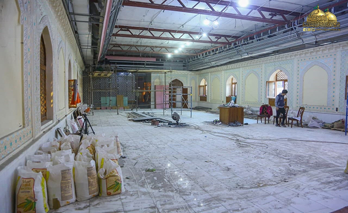 أما فيما يخص سقوف القاعة حيث تم تغييرها من خلال استخدام الألواح الجبسية، والسقوف الثانوية بناءً على متطلبات معمارية حيث امتزجت في تلك الأشكال الفنية ثقافة العمارة الإسلامية والتراث الأصيل بإبداع الهندسة العصرية الحديثة، كذلك تم إجراء تعديلات لمختلف الخدمات والمنظومات الموجودة في القاعة منها نظام الإنارة المستخدم من خلال تراكيب جديدة حققت النسق العلمي المطلوب الذي يتناسب مع حجم وتصميم القاعة وكانت هذه الأعمال بجهود ذاتية مباركة مقدّمةً من قبل مهندسي وفنيي شعبة الهندسة الكهربائية في العتبة المقدسة.
