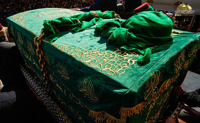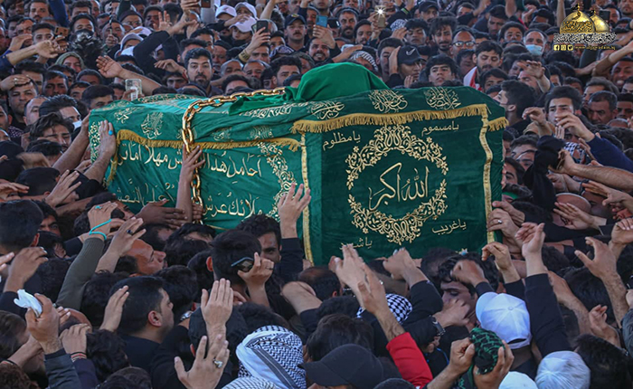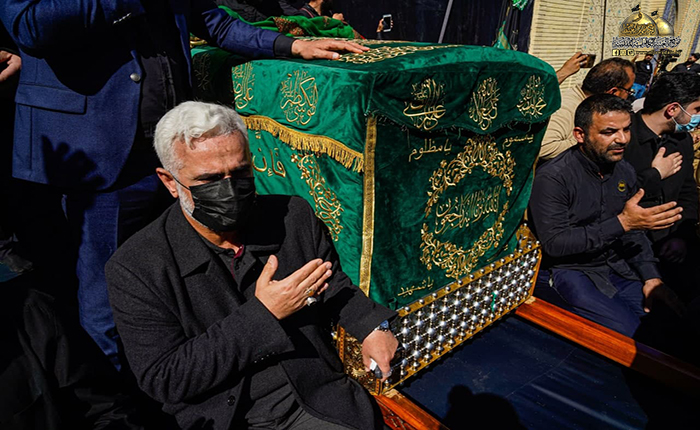 جُلجلت القيود ودوت الأصفاد لتُنذر بصداها العالم الإسلامي قدوم مناسبة ذكرى شهادة رهين السجون والمغيّب في ظلم المطامير الإمام موسى بن جعفر الكاظم "عليه السلام"، وما كان للملايين من الموالين والمحبين إلا التلبية والسعي الحثيث من كل حدب وصوب قاصدين جنته ومرقده الشريف إحياءً لذكراه الأليمة ومعزين لحفيده صاحب العصر والزمان الإمام المهدي "عجل الله فرجه الشريف"، حيث شهدت مدينة الكاظمية المقدسة صباح يوم الأحد الخامس والعشرين من شهر رجب الأصب 1443 هـ الموافق 27/ شباط 2022 مراسم التشييع الرمزي لنعش المسموم والمظلوم الإمام موسى بن جعفر الكاظم "عليه السلام" محفوفاً بالحشود الهائلة عبر مسيرة إيمانية متجهة صوب الصحن الكاظمي الشريف، حيث استقبل بالتكبير والخشوع والهيبة وذرف الدموع من قبل المعزّين، وحضر هذه المراسم الأليمة خادم الإمامين الكاظمين الجوادين، الأمين العام للعتبة الكاظمية المقدسة الدكتور حيدر حسن الشمّري وأعضاء مجلس الإدارة الموقّر، وخدام العتبة المقدسة، وأهالي مدينة الكاظمية المقدسة، وشخصيات دينية واجتماعية، وبمشاركة الحشود المليونية الوافدة إلى الصحن الكاظمي الشريف والتي استمر توافدها على مدى أيام عدّة من مختلف أنحاء البلاد وخارجها.