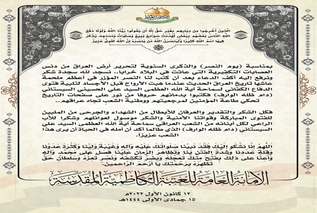 كلمة الأمانة العامة للعتبة الكاظمية المقدسة لمناسبة (يوم النصر) والذكرى السنوية لتحرير أرض العراق