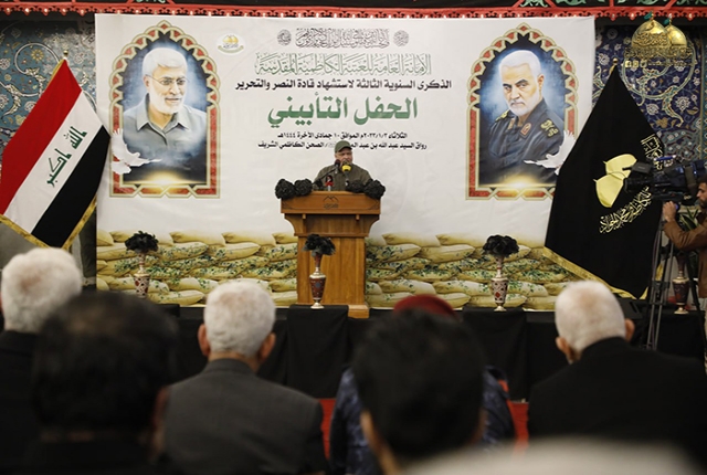 واستهل الحفل بتلاوة آي من الذكر الحكيم، تلتها كلمة الأمانة العامة للعتبة الكاظمية المقدسة ألقاها أمينها العام، حيث استشهد في مقدمتها بالكلمة التي وردت من مكتب سماحة المرجع الديني الأعلى السيد علي الحسيني السيستاني (دام ظله الوارف)، وقرأت في حينها على الملأ بكربلاء المقدسة في خطبة أول جمعة بعد استشهاد قادة النصر ورفاقهم الأبطال، وما تضمنته من كلمات تصوّر عظم الألم الممتزج بالخوف على عراق المقدسات، وفداحة الخطب ووحشية العدو المتربص بشعب هذا البلد الجريح، وأضاف قائلاً:( نقف اليوم في الذكرى الثالثة لاستشهاد المجاهد أبي مهدي المهندس ورفيق دربه الحاج قاسم سليماني وثلة مؤمنة ممن كانوا معهما لنؤبن قامتين من قامات الجهاد في العصر الحديث فالتاريخ كانَ شاهدا على تضحياتِهِم وتضحيات كل الملبين لفتوى الدفاع الكفائي من أجلِنَا، ومن أجلِ مقدساتِنا، (والجودُ بالنفسِ أقصى غايةِ الجودِ)، وأبلغُ كلمات نقدِّمُها إليهِمْ هو الإقرارُ والعرفانُ بأنَّهم أهلُ ذلكَ النصر، فما أعظمَها من كلماتٍ حيثُ عبَّرَتِ المرجعيةُ في بيانِ النصرِ بالقول: (فالنصرُ منكُمْ ولَكُمْ وإليكُمْ وأنتُمْ أهلُهُ وأصحابُهُ فهنيئًا لكم به وهنيئًا لشعبِكُم بكم وبوركتُمْ وبورِكَت تلكَ السواعِدُ الكريمةُ التي قاتلتم بها، وبوركَتْ تلكَ الحجورُ الطاهرَةُ التي رُبِّيتُمْ فيها، أنتُمْ فخرُنا وعِزُّنا ومَنْ نباهي بهِ سائِرَ الأمم).