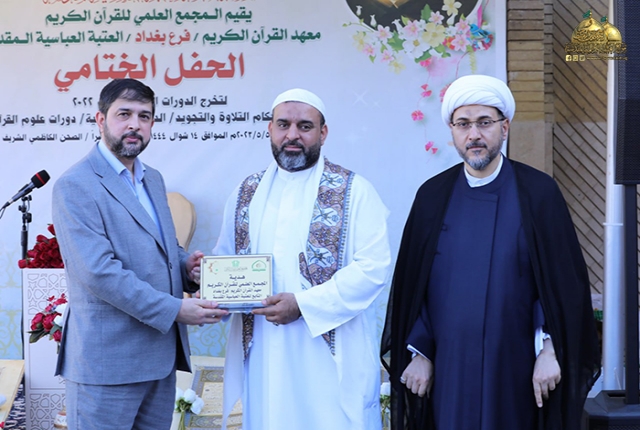 من بقعة الطهر المُفعمة بالقداسة والإيمان من رحاب الإمامين الهمامين موسى بن جعفر الكاظم ومحمد بن علي الجواد "عليهما السلام" استضافت الأمانة العامة للعتبة الكاظمية المقدسة وبالتعاون مع الأمانة العامة للعتبة العباسية المقدسة/ المَجمع العلمي للقرآن الكريم ـ معهد القرآن الكريم فرع بغداد حفل اختتام دورات أحكام التلاوة والتجويد، والدورات التحقيقية، ودورات علوم القرآن الكريم بمشاركة (550) طالب، وبحضور نخبة من ممثلي المؤسسات والروابط القرآنية والمهتمين بالشأن القرآني.