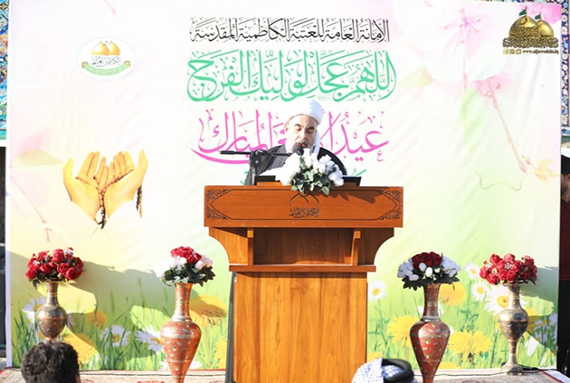 وأمَّ جموع المُصلين ممثل المرجعية الدينية العُليا في مدينة الكاظمية المقدسة سماحة الشيخ حُسين آل ياسين "دامت توفيقاته"، مستهلا الخطبة بعد الصلاة بدعاء الإمام علي بن الحسين زين العابدين "عليه السلام": (اللّهم فأوزع لوليك شكر ما أنعمت عليه وأوزعنا مثله قبله، وآته من لدنك سلطانا نصيرا، وافتح له فتحا يسيرا، وأعنه بركنك الأعزّ، واشدد أزره وقوّ عضده وراعه بعينك واحمه بحفظك وانصره بملائكتك وامدده بجندك الأغلب وأقم به كتابك وحدودك وشرائعك وسنن نبيّك ورسولك عليه وآله السّلام)، نعم يا ربي لبيك وسعديك والخير كله بين يديك والشر ليس إليك، ودعا في معرضها إلى ضرورة الرجوع إلى الله والقرب من مالك الملك والتعلق بحبال أستاره والتوبة إليه واتباع أحكامه.