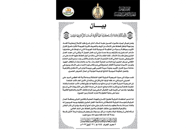 نضم صوتنا إلى صوت المرجعية الدينية العليا المتمثلة بسماحة آية الله العظمي السيد علي الحسيني السيستاني دام ظله الوارف الذي قال في رسالته إلى الأمين العام للأمم المتحدة (إن المرجعية الدينية العليا إذ تبدي إدانتها واستنكارها لما وقع تطالب الأمم المتحدة باتخاذ خطوات فاعلة بمنع تكرار أمثاله ودفع الدول الى إعادة النظر في التشريعات التي تسمح بوقوعها، وتدعو الى تثبيت قيم التعايش السلمي بين أتباع مختلف الأديان والمناهج الفكرية مبنياً على رعاية الحقوق والاحترام المتبادل بين الجميع).