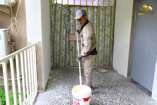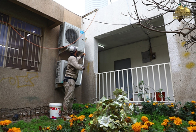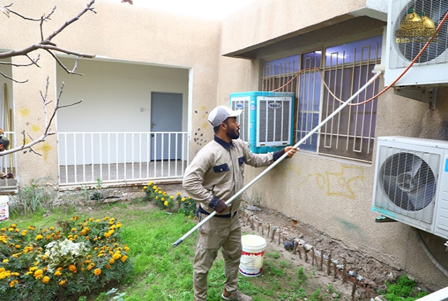 وشهد البرنامج الخدمي حملة إدامة المجموعات الصحية وصيانة شبكات الصرف الصحي، وتبديل الأنابيب والحنفيات والخزانات والمستلزمات الأخرى، ومعالجة السطوح نظراً لما تعرضت إليه نتيجة الظروف الجوية وعوامل تقادم الزمن، وإزالة الطلس القديم ومعالجة المتضرّر من جدران الصفوف والممرات والواجهات والأسوار وتهيئتها للطلاء، فضلاً عن صيانة منظومة الإنارة، واستبدال المصابيح العاطلة بأخرى جديدة.