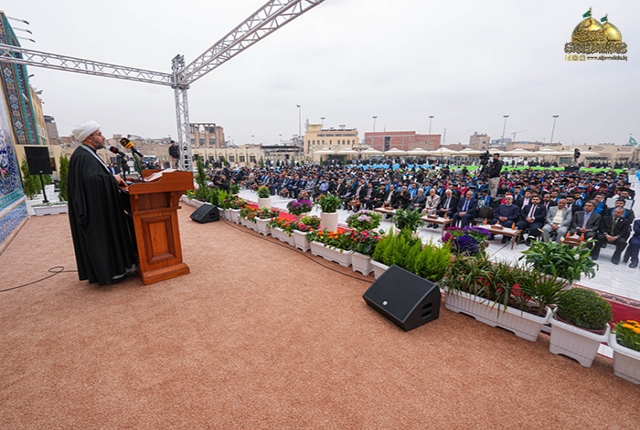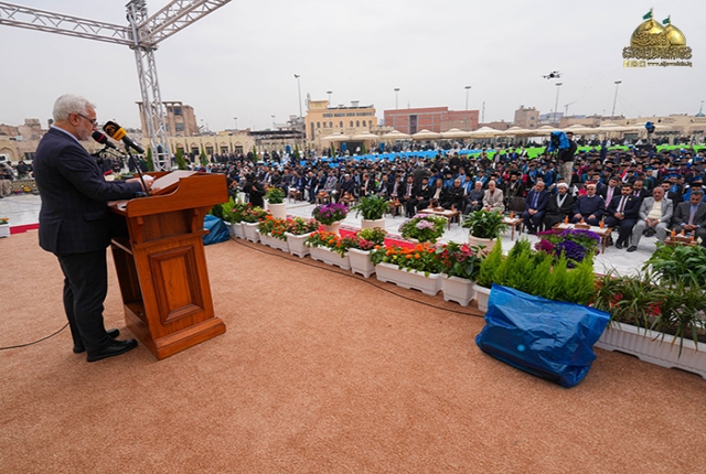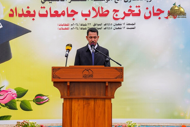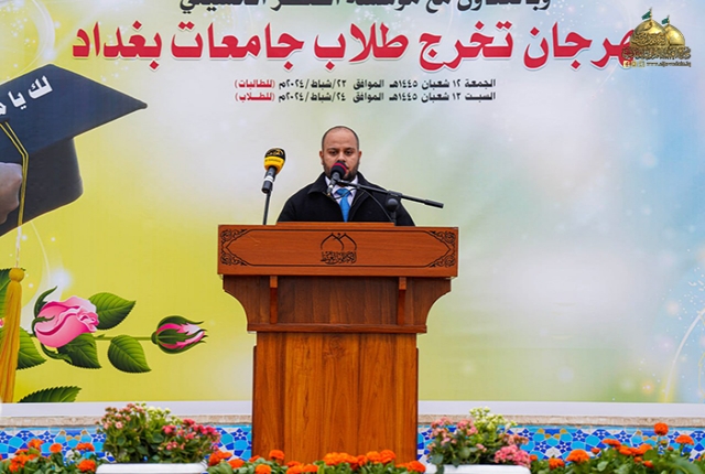 أعقبها كلمة للأمين العام للعتبة الكاظمية المقدسة وجّه فيها رسالته الأبوية للطلبة المحتفى بهم وشباب العراق قائلاً: (أتوجه إليكم بكلمات التهاني والتبريكات بذكرى ولادة منقذ البشرية، وذكرى انطلاق فتوى الدفاع الكفائي التي لولاها لما وقفنا هذه الوقفة المباركة كما نهنئ أنفسنا ووزارة التعليم العالي والبحث العلمي، ورئاسات الجامعات وعمادات الكليات والمعاهد، والهيئات التدريسية، وأولياء الأمور الأعزاء وطلبتنا وأبنائنا الكرام، ونهنئكم بتخرجكم هذا بعد أن واجهتم التحديات والصعاب على مدار سنوات دراستكم وأعلموا أن هذا اليوم هو يوم ميلاد جديد لكم وبداية مرحلة جديدة من حياتكم المهنية والشخصية، إذا أمامكم عالم من الفرص والامكانيات وأنا واثق بأنكم سوف تستثمرون هذه الفرص بأفضل طريقة ممكنة فأنتم تمثلون جيل المستقبل ورجال الغد، وعليكم أن تضعوا بصمتكم على هذا العالم وتسهموا في بناء وطنكم العراق العزيز لذلك أذكركم أبنائي بوصايا أهل البيت "صلوات الله عليهم أجمعين" لتكون نصب أعينكم خلال رحلتكم في سنين حياتكم المباركة القادمة، إذ ورد عن رسول الله "صلى الله عليه وآله وسلم": (إن الله تعالى يباهي بالشاب العابد الملائكة، يقول: انظروا إلى عبدي! ترك شهوته من أجلي)، وعن أمير المؤمنين الإمام علي بن أبي طالب "عليه السلام" أنه قال: (يا معشر الفتيان، حصنوا أعراضكم بالأدب، ودينكم بالعلم)، وقالت السيدة فاطمة الزهراء "عليها السلام": (من أصعد إلى الله خالص عبادته أهبط الله عز وجل له أفضل مصلحته)، ومن وصايا الإمام موسى بن جعفر الكاظم "عليه السلام" أنه قال: (من صدق لسانه زكا عمله ومن حسنت نيته زاد الله عز وجل في رزقه ومن حسن بره بأهله زاد الله في عمره)، وعن الإمام محمد بن علي الجواد "عليه السلام" أنه قال: (ثلاث من كن فيه لم يندم: ترك العجلة، والمشورة، والتوكل على الله عند العزم)، وورد عن الإمام المهدي المنتظر "عجل الله فرجه الشريف" أنه قال: (فليعمل كل امرئ منكم بما يقرب به من محبتنا، وليتجنب ما يدنيه من كراهتنا وسخطنا). فلنكن زيناً لمحمد وآل محمد ولا نكن شيناً عليهم).