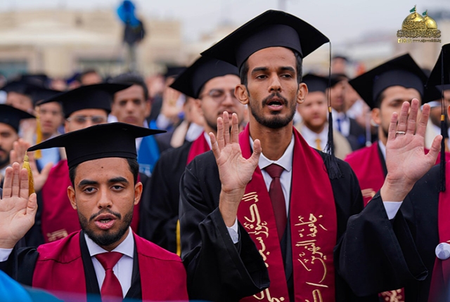 ثم ردد الخريجين القسم مع الأمين العام للعتبة الكاظمية المقدسة، خادم الإمامين الكاظمين الجوادين الدكتور حيدر حسن الشمّري، والذي تضمن