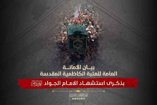 من هذه الرحاب الطاهرة ومن جوار مرقد صاحب الذكرى الأليمة المسموم المظلوم إمامنا محمد بن علي الجواد عليه السلام نرفع إلى مقام الحجة بن الحسن عجل الله تعالى فرجه الشريف وإلى مراجعنا العظام والعالمَين الإسلامي والإنساني وإليكم أيها الموالون المعزون أحر التعازي بذكرى شهادة الإمام محمد بن علي الجواد عليه السلام.. حيث تآلفت القلوب وبكت العيون لهول المصاب في رحاب الإمامين الكاظمين الجوادين عليهما السلام وارتفعت أكف الدعاء لتجديد العهد والولاء وتقديم المواساة للنبي الأعظم محمد وآله الكرام سلام الله عليهم أجمعين لا سيما صاحب العصر والزمان عجل الله فرجه بهذا المصاب الجلل.