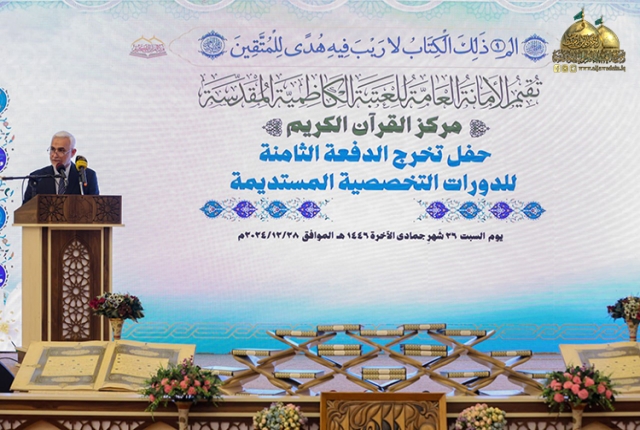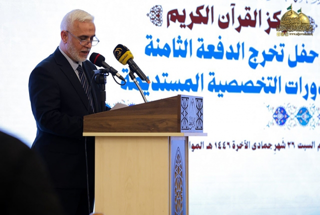 وأضاف: أن هذه الدورات هي استثمار في الدنيا والأخرة، وبناء للأجيال على أساس متين من الإيمان والمعرفة، وهي أيضاً محطات للتربية والتعليم وتزكية النفس حيث تعلّمنا كيف نجعل من القرآن الكريم دستوراً نهتدي به، ونوراً نسير على ضوئه، فهنيئاً لكم أيها الخريجون والخريجات هذا الإنجاز العظيم، وهنيئاً لكم الشرف بحفظ كتاب الله وتلاوته وتفسيره وتعلمه، وأن ما وصلتم إليه اليوم ما هو إلا استكمال للطريق في خدمة القرآن الكريم والعمل به، فجعلوا القرآن نبراس حياتكم، وكونوا قدوة صالحة في أُسَرِكم ومجتمعكم، واحملوا رسالة القرآن الكريم نحو المجتمع بكل حُب وإخلاص، ولا يفوتنا في هذا المقام الكريم أن نوجه الشكر الجزيل والثناء الجميل إلى من كلّ من كان له دور في إنجاح الدورات التخصصية المستديمة في دفعتها الثامنة الطلبة والطالبات لمواظبتهم وحضورهم ونجاحهم.. المعلمين والمعلمات الذين بذلوا أوقاتهم وجهودهم بصبر وإخلاص.. وأولياء الأمور الكرام الذين كانوا داعمين ومساندين، وكل من ساهم في إنجاح هذا العمل المبارك في مركز القرآن الكريم للعتبة الكاظمية المقدسة من داخله وخارجه من الأقسام والشُعب والوحدات الساندة، ونسأل الله العلي العظيم أن يجعل القرآن ربيع قلوبنا ونور صدورنا وجلاء أحزاننا.. )