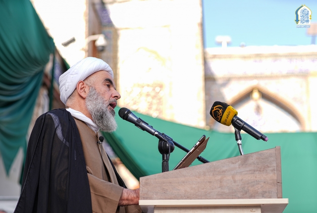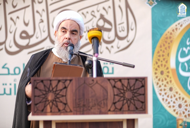 وشهدت شعائر صلاة عيد الفطر المبارك خطبة عبادية دعا في مطلعها بتعجيل فرج مولانا صاحب العصر والزمان الإمام المهدي المنتظر "عجل الله تعالى فرجه الشريف"، وأكد في خطبته على مبدأ الطاعة والتقوى والخوف من الله والتماس التوبة والعودة إلى حضرته القدسية مستشهداً بشذرات من وصايا أمير المؤمنين الإمام علي "عليه السلام" قبل رحيله قائلاً: (أوصيك يا حسن وجميع أهل بيتي وولدي ومن بلغه كتابي بتقوى الله ربكم، ولا تموتن إلا وانتم مسلمون، واعتصموا بحبل الله جميعا ولا تفرقوا، فاني سمعت رسول الله (صلى الله عليه واله) يقول : صلاح ذات البين أفضل من عامة الصلاة والصيام، وان المبيرة الحالقة للدين فساد ذات البين، ولا قوة إلا بالله العلي العظيم انظروا ذوي أرحامكم فصلوهم يهون الله عليكم الحساب الله الله في الأيتام فلا تغيروا أفواههم، ولا يضيعو بحضرتكم، فقد سمعت رسول الله (صلى الله عليه واله) يقول : من عال يتيما حتى يستغني أوجب الله عز وجل لذلك له الجنة كما أوجب الله لآكل مال اليتيم النار.