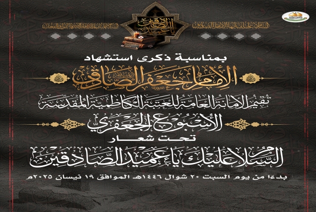 انطلاقاً من واجبها الرسالي، وإحياءً لذكرى استشهاد سادس أئمة أهل البيت الهداة، الإمام جعفر بن محمد الصادق "عليه السلام"، تعلن الأمانة العامة للعتبة الكاظمية المقدسة عن انطلاق (الاسبوع الجعفري الفكري الثقافي الانساني)، متوّجاً بشعار (السلام عليك يا عميد الصادقين).
