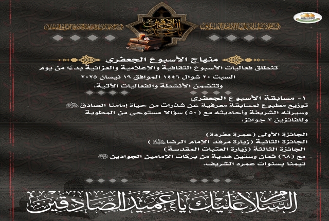 ويتضمن هذا الأسبوع باقة متنوعة من البرامج الفكرية والثقافية والإعلامية والخدمية، التي تستلهم من سيرة الإمام "عليه السلام" عبق العلم، ونور الهداية، وروح الرسالة. وتشمل هذه الفعاليات: محفلًا قرآنيًا يُهدى ثوابه إلى إمامنا الصادق "عليه السلام"، وسلسلة المجالس العزائية والتأبينية، مسابقة معرفية من خلال مطوية ستوزع على الزائرين الكرام تُبرز الإرث العلمي للإمام "عليه السلام"، وندوات علمية وحوارية تُقام عبر المنصة الكاظمية، وبرامج فكرية وأدبية تسلط الضوء على معالم شخصيته المباركة، وفعاليات يوم الزائر الصغير المخصصة للطفولة لغرس القيم الصادقية في نفوس الناشئة، ومراسم رفع الرايات السوداء فوق قباب العتبات المقدسة والمزارات الشريفة، إيذانًا بإعلان الحِداد في هذه الذكرى الأليمة.