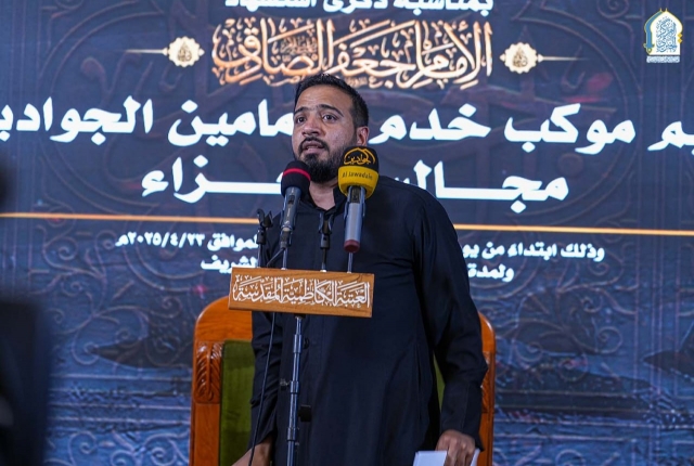 ثم اعتلى المنبر كل من: الرادودين الخادم كرار الكاظمي، والخادم علي عامر الكاظمي لقراءة قصائد النعي والرثاء لصاحب المصيبة الكبرى الإمام الصادق "عليه السلام" ملاذ المؤمنين وكهفهم الحصين.