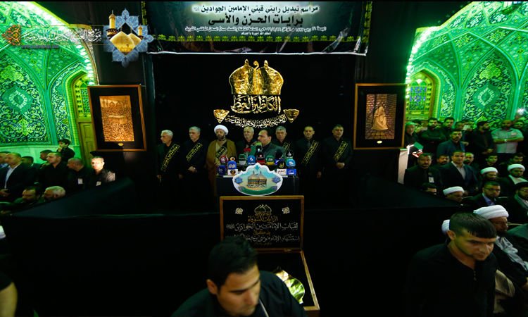 مرة أخرى يجدد الموالون والمحبون عهدهم وبيعتهم للإمام موسى بن جعفر الكاظم "عليه السلام" وهم يرفعون رايات الحزن والأسى التي حملت في طياتها معانٍ كظم الغيظ والصبر على الأذى في جنب الله، وتجلت فيها سيرة إمام أثرى الضمير الإنساني بالدروس والعبر والقيم الإنسانية السامية واشرقت فيها صور الحب المتجذر للموالين عبر أعماق السنين وعمق الولاء الحقيقي الذي بدى يسري بعروقهم، ليقفوا اليوم على أعتاب الوفاء ملبية النداء لمولاها المظلوم المسموم باب الحوائج "عليه السلام"، إذ شهدت رحاب الصحن الكاظمي الشريف ليلة الجمعة 20 رجب الأصب 1437هـ، الموافق 29 نيسان 2016استبدال رايتي قبتي الإمامين الجوادين "عليهما السلام" برايات الحزن السوداء في مراسم مهيبة جرت وسط حضور والأمين العام للعتبة الكاظمية المقدسة أ. د جمال عبد الرسول الدباغ ووكيل المرجع الديني الأعلى سماحة آية الله العظمى السيد علي الحسيني السيستاني "دام ظله الوارف" في مدينة الكاظمية المقدسة سماحة الشيخ حسين آل ياسين، والسادة أعضاء مجلس الإدارة، وممثلي العتبات المقدسة، ونخبة السادة الأجلاء والمشايخ الفضلاء أصحاب المشروع التبليغي وعدد من الشخصيات والاجتماعية وجمع غفير من وجهاء وشيوخ مدينة الكاظمية المقدسة ومسؤولي دوائرها الأمنية والخدمية وزائري الإمامين الجوادين "عليهما السلام". استهلت المراسم بتلاوة مباركة من الذكر الحكيم شنف بها قارئ العتبة رافع العامري أسماع الحاضرين، تلتها كلمة الأمانة العامة للعتبة الكاظمية المقدسة بيّن فيها قائلاً: ( نستذكر استشهاد الإمام موسى بن جعفر الكاظم "عليه السلام" وتَمثُلُ أمامنا الدروس والعبرُ، التي لا مناصَ لكل عاقلٍ ومتدبرٍ أن يستعبر منها ويتخذها منهاجاً ودستوراً في حياته، ومن أهم الدروس، مسألة المواجهة بين الحق والباطل، وبين النور والظُلمة، بين دعاة الله ودعاة الشيطان والتي لم ولن تقف أبدا، فبالأمس كانت فاجعة مولانا موسى بن جعفر "عليه السلام" ولا زالت هذه الحرب مستمرة إلى يومنا الحاضر، فالظلم له جذور وأعوان كما أن للحق أنصار وحملة، ومن الضروري أن لا يرضخ أهل الحق والإصلاح للظلم والفساد طرفة عين أبدا مهما كانت التضحيات بالغة وكبيرة).
