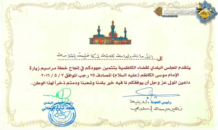 المجلس البلدي لقضاء الكاظمية المقدسة يهدي شكره وتقديره إلى الأمانة العامة للعتبة الكاظمية المقدسة