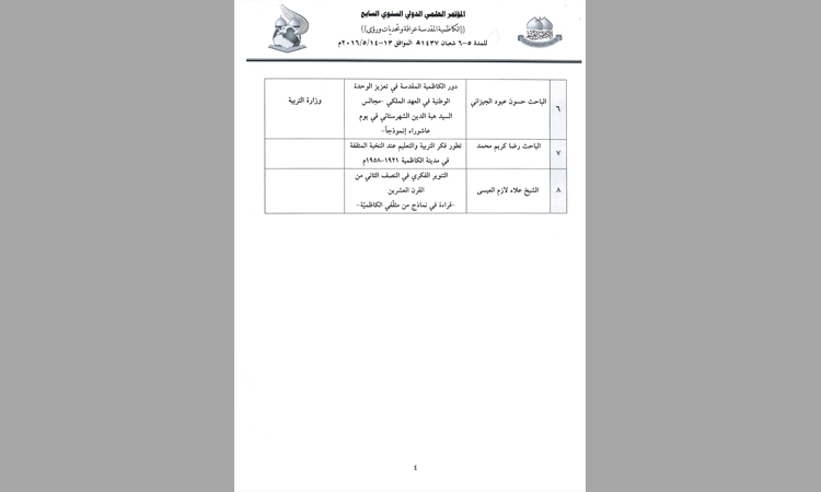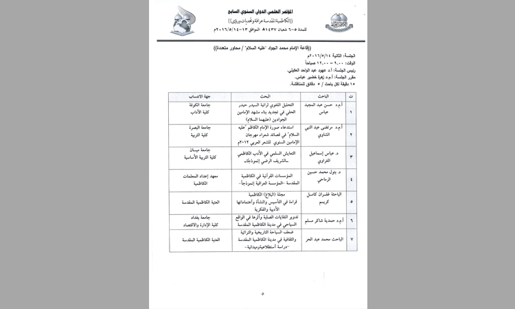 وضعت اللجنة التحضيرية للمؤتمر العلمي الدولي السابع الذي سيعقد للمدة من 5ـ6 شعبان الموافق 13ـ14 آيار 2016م تحت شعار: مدينة الكاظمية (عراقة وتحديات ورؤى ) اللمسات الأخيرة والاستعدادت النهائية لاستكمال تحضيرات انعقاده، إذ تعلن اليوم عن البرنامج التعريفي الخاص بالفعاليات وأسماء الباحثين المشاركين في المؤتمر في الجدول المبين أدناه.