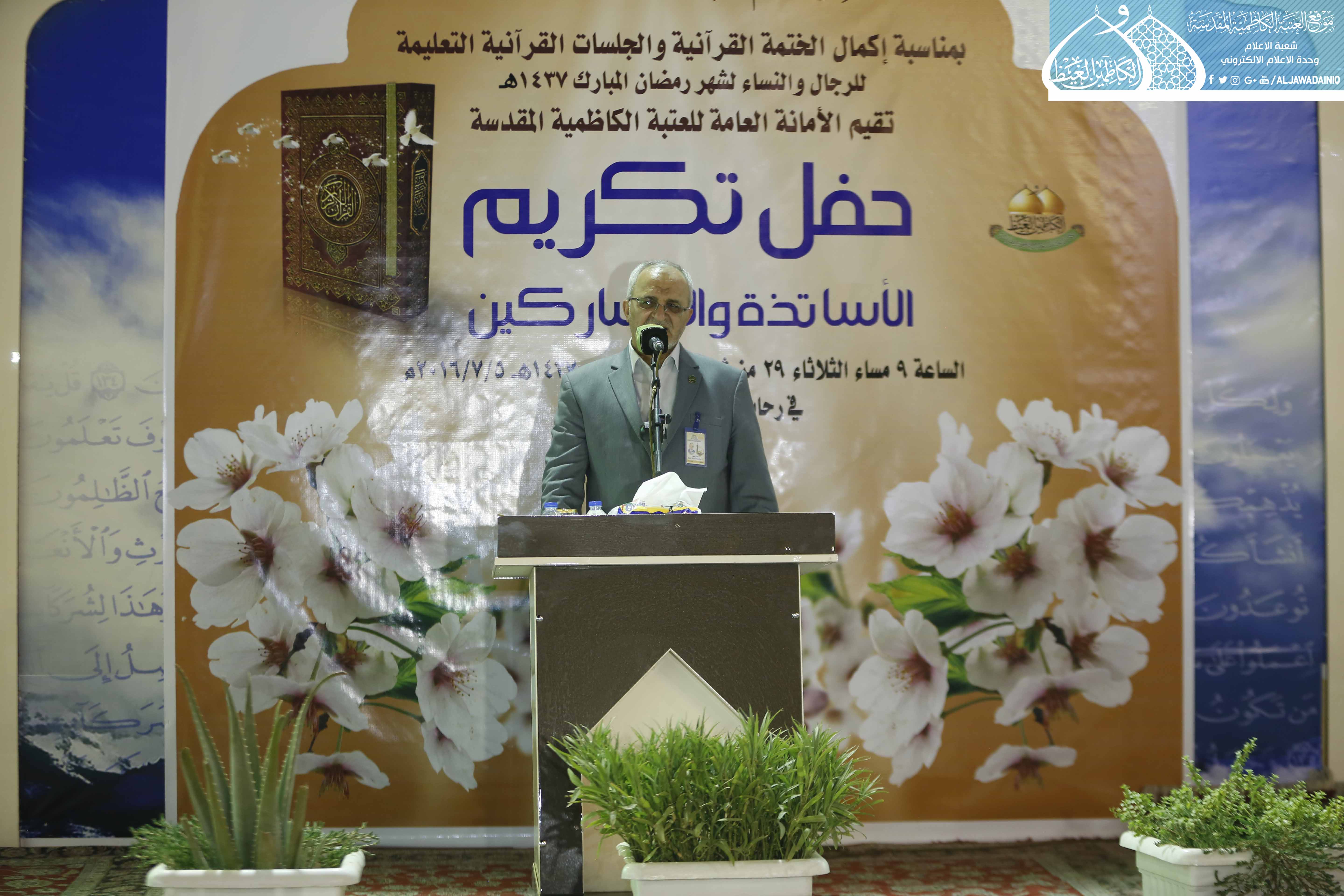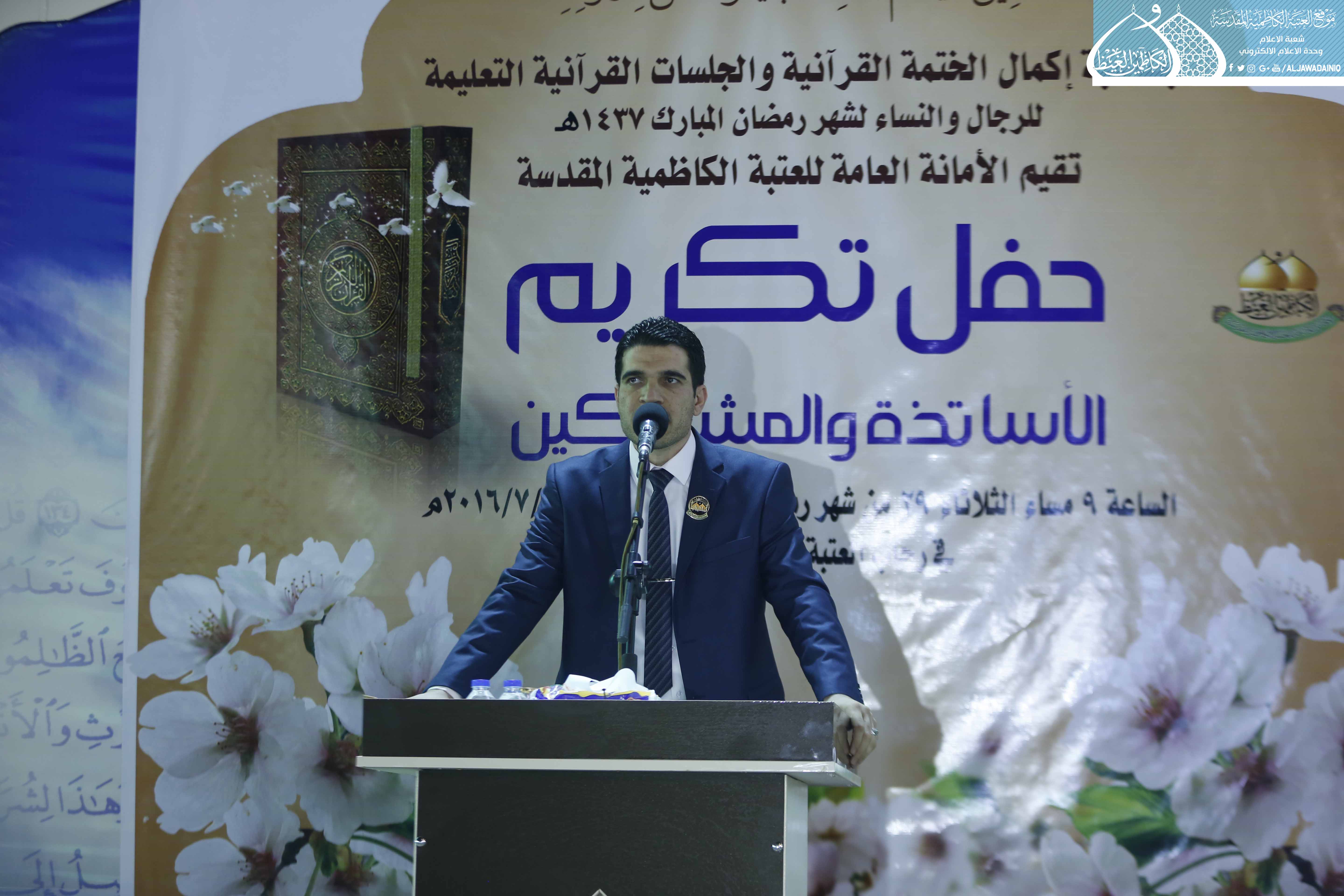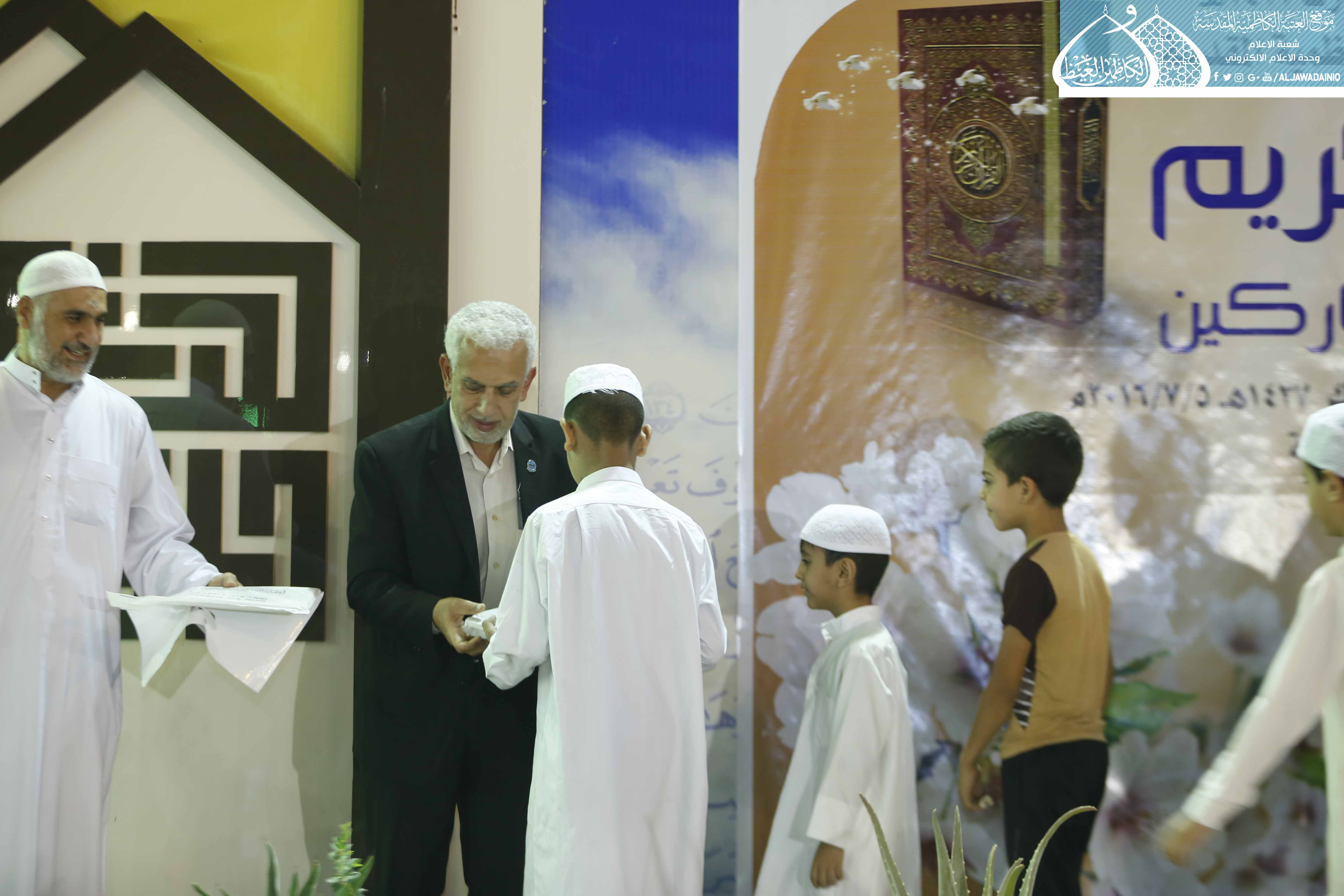 كما نستثمر هذه الفرصة وأدعو أولياء الأمور إلى تشجيع أولادهم في الدورات الصيفية ودورات حفظ القرآن التي تقيمها العتبة المقدسة، لما لهذه الدورات من امكانية اكتشاف المواهب في الأداء والقراءة والحفظ لاحتضانها بعد ذلك في دورات وفق أسلوب أكاديمي، ختاماً نهدي جهودنا وما تلوناه من كتاب الله العزيز خلال الشهر المبارك هدية واصلة ورحمة نازلة إلى أرواح شهداء قواتنا الأمنية وحشدنا الشعبي وكذلك الشهداء من المدنيين الذين قضوا جرّاء العمليات الإرهابية لا سيما في منطقة الكرادة، واختتمت تلك الفعاليات بتوزيع الهدايا على أساتذة الدورات القرآنية والمشاركين من فيض بركات الإمامين الكاظمين "عليهما السلام".