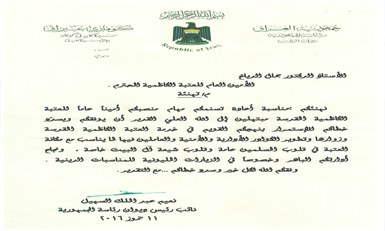 ديوان رئاسة جمهورية العراق يهنّئ الأستاذ الدكتور جمال عبد الرسول الدباغ بمناسبة تجديد تسنّمه مهام الأمانة العامة للعتبة الكاظمية المقدسة