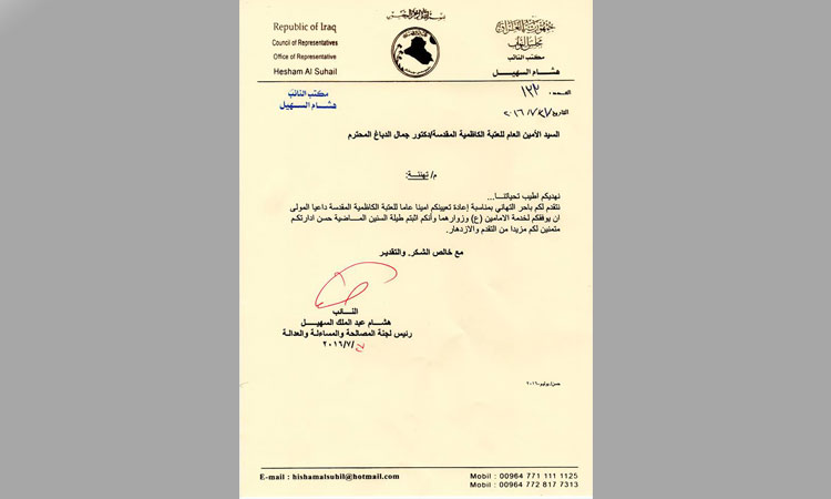 تقدم عضو مجلس النواب الأستاذ هشام السهيل رئيس لجنة المصالحة والمساءلة والعدالة بالتهاني والتبريكات إلى أ.د. جمال عبد الرسول الدباغ بمناسبة تجديد التكليف الشرعي لتسنم منصب الأمين العام للعتبة الكاظمية المقدسة، سائلين المولى العلي القدير أن يوفقكم ويسدد خطاكم في خدمة الإمامين الجوادين وزائريهم الكرام.