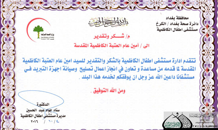إدارة مستشفى أطفال الكاظمية تتوجه بالشكر والتقدير إلى الأمين العام للعتبة الكاظمية المقدسة