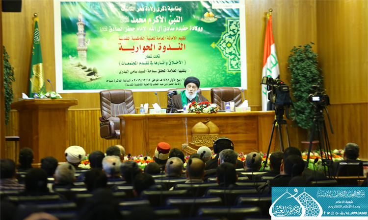 بالتزامن مع الذكرى (1490) لولادة خاتم الأنبياء والمرسلين المبعوث رحمة للعالمين محمد "صلّى الله عليه و آله وسلم" وحفيده الإمام جعفر الصادق "عليه السلام"، وضمن فقرات البرنامج الثقافي والإنساني الذي أطلقته العتبة الكاظمية المقدسة بهذه المناسبة تحت شعار: (رسولنا مثالنا .. رسولنا أسوتنا)، عقدت الأمانة العامة للعتبة الكاظمية المقدسة ندوة حوارية صباح يوم الأربعاء 14 ربيع الأول 1438هـ الموافق 14 كانون الأول في قاعة الحمزة بن عبد المطلب بعنوان: (الأخلاق وآثارها في تقدم المجتمعات)، بحضور نائب الأمين العام للعتبة الكاظمية، وعدد من أعضاء مجلس الإدارة، ورؤوساء أقسام وشعب العتبة المقدسة وخدام الإمامين الجوادين"عليهما السلام"، استهلت الندوة بتلاوة من الذكر الحكيم، بعدها عرّج العلامة المحقق سماحة السيد سامي البدري إلى أعظم شخصية عرفها الوجود، نبينا محمد "صلّى الله عليه وآله وسلّم" وسموّها ورفعتها وخُلقه السامي الثّر الذي أمتد ضياءه ليخترق الحُجب ويجتاح الآفاق، مستشهداً بقوله تعالى: (يَا أَيُّهَا النَّبِيُّ إِنَّا أَرْسَلْنَاكَ شَاهِدًا وَمُبَشِّرًا وَنَذِيرًا)، وبيّن سماحة السيد البدري أن رسول الله "صلّى الله عليه وآله وسلّم" هو الرجل الأول والأعظم شأناً في تاريخ الإنسانية بالحفاظ على كرامة الإنسان وصيانة حقوقه، كما لم تشهد الإنسانية أجمع نظيراً له في مستوى الارتقاء إلى أعلى مراتب الرحمة والحب والفضيلة، رغم كلّ ما تعرّض له "صلّى الله عليه وآله وسلّم" من إيذاء كابده في مسيرة جهاده الرسالية فقد كان يقابل الإساءة بالإحسان.