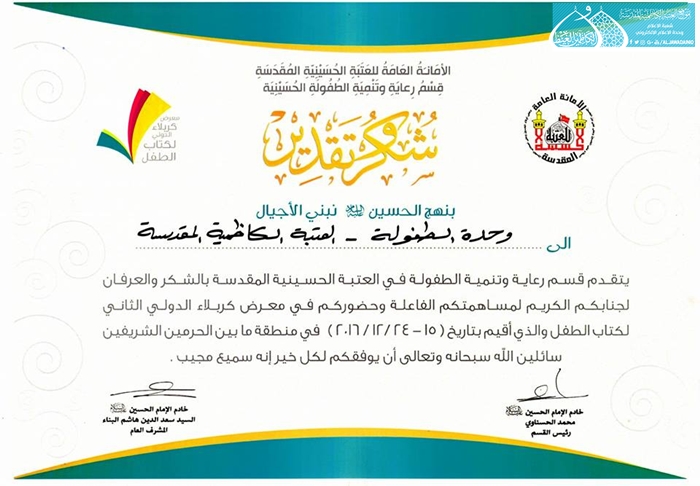 توجهت الأمانة العامة للعتبة الحسينية المقدسة / قسم رعاية وتنمية الطفولة بالشكر والتقدير إلى وحدة الطفولة التابعة لقسم الشؤون الفكرية والإعلام في العتبة الكاظمية المقدسة، وذلك لمشاركتها الفاعلة ومساهمتها الطيبة في معرض كربلاء الدولي الثاني، الذي انطلقت فعالياته في 15ـ 24 ربيع الأول 1438هـ، تحت شعار: (بنهج الحسين "عليه السلام" نبني الأجيال) سائلين المولى القدير أن يوفق الجميع لما يحب ويرضى. من الجدير بالذكر أنّ الأمانة العامة للعتبة الكاظمية المقدسة تواصل تحقيق أهدافها وبرامجها التنموية على الصعيد الرسالي والفكري والإنساني في دعم شريحة الطفولة وتنمية مهاراتها.