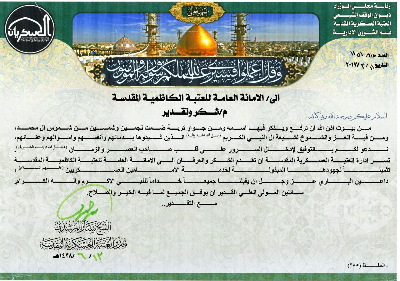 إدارة العتبة العسكرية المقدسة تتقدم بالشكر والتقدير إلى الأمانة العامة للعتبة الكاظمية المقدسة