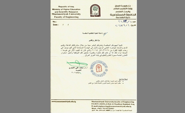 توجهت عمادة كلية الهندسة في الجامعة المستنصرية بالشكر والتقدير إلى الأمانة العامة للعتبة الكاظمية المقدسة، وذلك لجهودها المخلصة ومشاركتها الفاعلة في تقديم الدعم والإسناد للمؤتمر العلمي الرابع والأول في الهندسة المستدامة الذي أقيم للمدة من 28 ـ 29 آذار 2018.