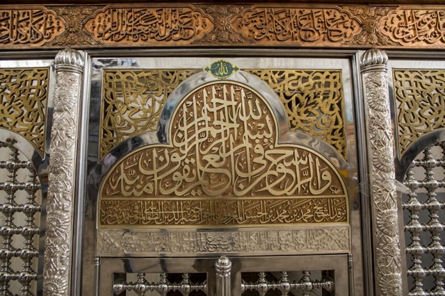 وبيّن الغرابي: "يتألف كلّ شباك من مشبكين يتوسطهما مشبك ثالث خُصص للباب، يعتلي كلّ مشبك مثلث زخرفي يُحاط في جوانبه السفلية بإطار فضي لأرباع دوائر، ويرتكز على هذه المشبكات شريط كتابي فوقه إفريز زخرفيّ يتوسّطه شريطٌ كتابي آخر وبنقوش نباتية غاية في الروعة، يعتلي هذا الإفريز شريطٌ كتابي آخر ثبّتت فوقه أجزاء مذهبة من زهور اللوتس، كذلك يتألّف كلّ شباك من أربعة أعمدة جانبية ذات نقوش وزخارف نباتية تستند على إطارٍ فضي مزخرف، وجميع هذه الأجزاء ترتبط وتركّب على هيكلٍ خشبي تميزت صناعته بأفخر أنواع خشب الساج ".