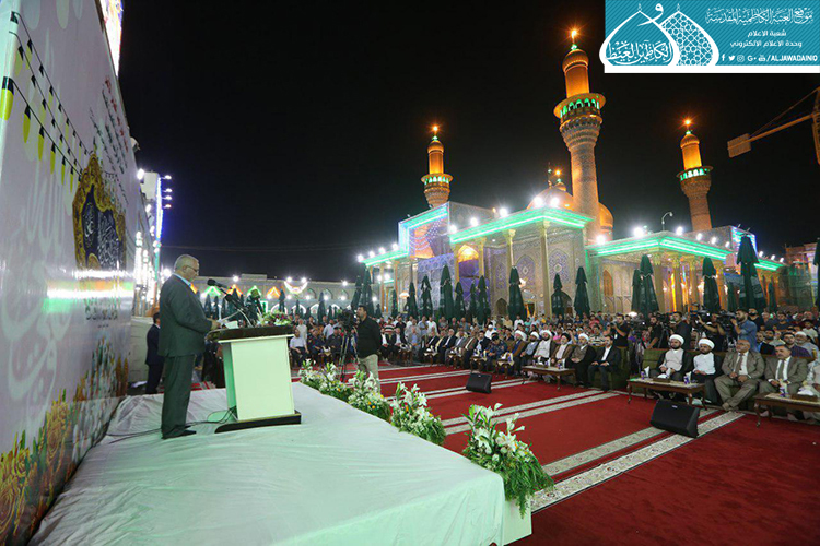 حضورَنا الكريم: ونحن نحتفلُ في هذا اليوم الأغر، والأفراحُ تملأُ فضاءَنا، يزدانُ فرحُنا بالمسرات ونحن نفتتحُ شباكي الولاء، الأول: للشيخ المفيد وأستاذه ابن قولويه (رحمهما الله)، والثاني: للشيخ الخواجة نصير الدين الطوسي(رحمه الله)، بما يستحقانه ويزيّنان مرقديهما، ويُدخل السرور على صدور المؤمنين، وقد تم صنعَهما على نفقة العتبة المقدسة في مصانع السقّاء التابعة للعتبة العباسية المقدسة.