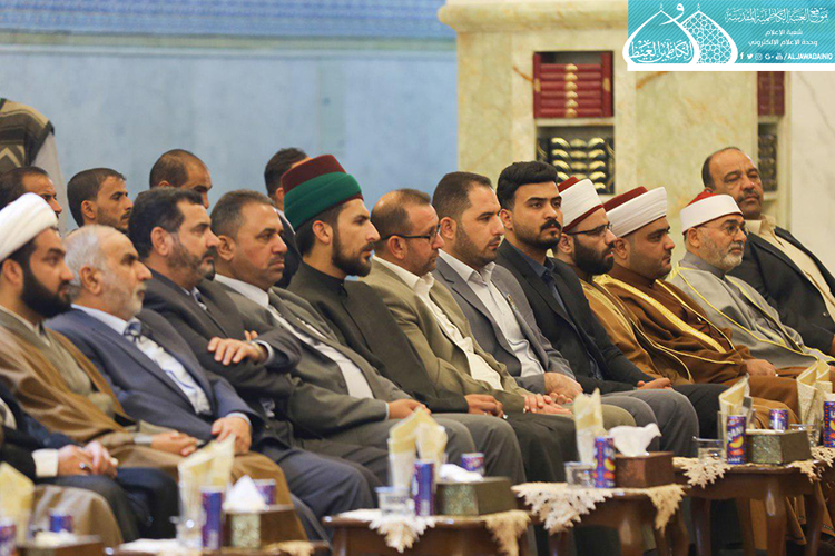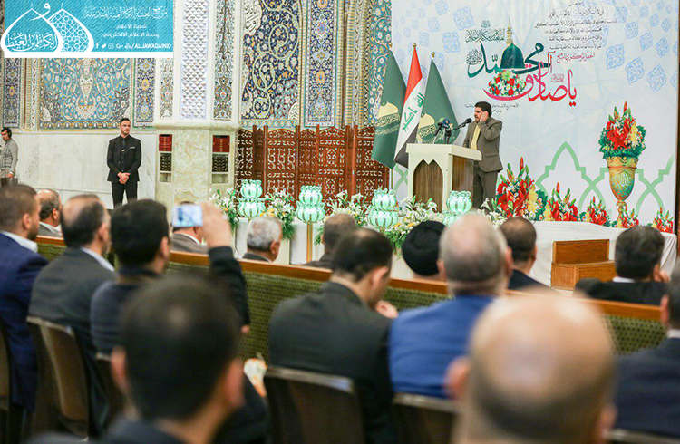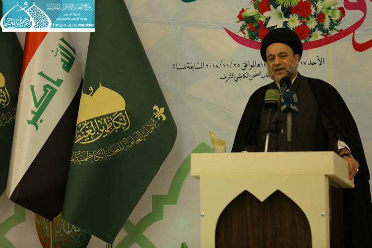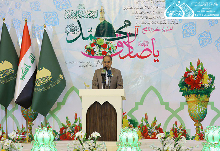 تلتها كلمة العتبة الكاظمية المقدسة وألقاها أمينها العام الأستاذ الدكتور جمال عبد الرسول الدباغ قائلاً: " عندما نحتفلُ بذكرى ولادةِ خاتمِ الأنبياءِ محمدٍ المصطفى " صلى الله عليه وآله وسلم"، فإنَّ هذا يعني أننا نحتفلُ بولادةِ القدوةِ المتمثلَةِ بالأنموذجِ الأمثلِ للإنسانِ الكاملِ، والمنظومةِ الأخلاقيةِ الكاملةِ المهداةِ إلى العالمِ أجمعَ، فإنّ اللهَ تعالى ادّخرَهُ ليختِمَ بهِ أنبياءَهُ ورسلَهُ ويختِمَ بهِ رسالاتِهِ، ويكونَ شاهداً على أمتِهِ وجميعِ الأممِ.