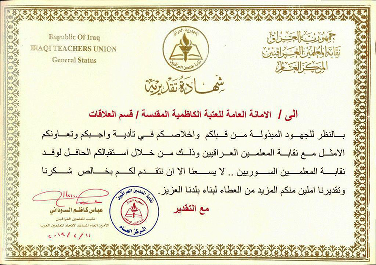 نقابة المعلمين العراقيين/ المركز العام تُهدي شكرها وتقديرها إلى الأمانة العامة للعتبة الكاظمية المقدسة