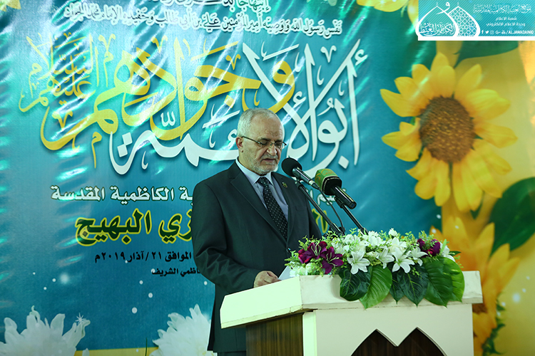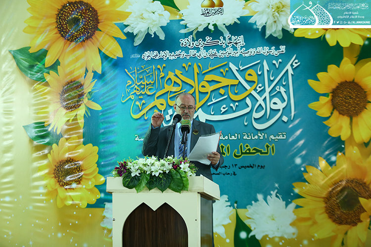 استٌهل الحفل بتلاوة آيات من الذكر الحكيم شنّف بها القارئ السيد عبد الكريم قاسم أسماع الحاضرين، تلتها كلمة الأمانة العامة للعتبة الكاظمية المقدسة ألقاها أمينها العام قائلاً: ( مع تقادمِ الأزمانِ، تعاودُنا في شهرٍ تعلوهُ غرةٌ غرّاءُ وهو شهرُ رجبٍ الأصبِّ، وقائعُ باسقاتٌ، حيث ولادةُ إمامِ المتقينَ وحفيدِهِ جوادِ العترةِ الهاديةِ "عليهما السلام". فمن المناسبِ جداً أن لا ينحصرَ الاحتفالُ بهاتينِ المناسبتينِ البهيَّتينِ في زاويةِ الثناءِ والإطراءِ الذي لا يؤدّي أي خدمةٍ لمنطقِ الوعي الإسلامي، أو أن ننظرَ إلى الولادتينِ الميمونتينِ على أنَّهما مجردُ استرجاعٍ لذكرى طيّبةٍ من دونِ أن نُدركَ مغزاهما الإنساني. فولاداتُ الأئمةِ الأطهارِ "عليهم السلام" هي نقاطٌ مضيئةٌ في حياتِنا يجبُ أن لا نمرَّ بها مروراً سطحياً، لذلك باتَ من اللبِّ أن نجعلَ من هذهِ المناسباتِ الروحيةِ محطّاتٍ للتزود بالزاد، وباعثاً ذاتياً يُحرّكُ فينا الصمودَ والجهادَ، ويقلبُ بوارَ نفوسِنا جناناً، وذلك يكون بعد أن نَعِيَ قيمتَها ونُحسنَ استثمارَها ونستلهمَ من هديِها. فالعِبرةُ التي يجبُ أن نخرجَ بها من هذا الإحياءِ والاحتفاءِ في حاضرِنا الراهنِ ونحنُ نعيشُ هذهِ الأوضاعَ المضطربةَ، حيث تشتدُّ حملةُ الإرهابِ المسعورةُ على الطليعةِ المؤمنةِ والبقيةِ الصامدةِ، هو أن نتابعَ خطواتِ أصحابِ هذه الذكرى في الدفاعِ عن بيضةِ الإسلامِ، وأن نجعلَ من جهادِهم رائدَنا في كفاحِنا ونضالِنا اليوم ضد أعدائهم.