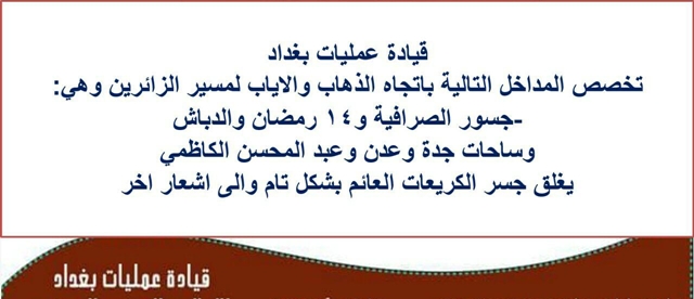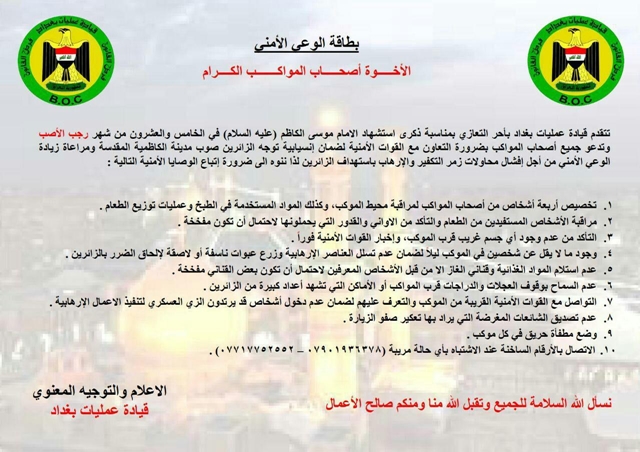 هناك دور كبير ومهم تؤديه القوات الأمنية، وعلى وجه الخصوص في المناسبات المليونية التي تشهدها مدن العتبات المقدسة، لأجل سلامة الزائرين الكرام، والمحافظة على أمنهم وسلامتهم، ومنع المحاولات الإرهابية من التأثير على صفو الزيارة، حيث دعت قيادة عمليات بغداد/ الإعلام والتوجيه المعنوي الزائرين الكرام وأصحاب المواكب الخدمية الالتزام بالتعليمات وإتباع الوصايا الواردة في بطاقة الوعي الأمني الآتية: