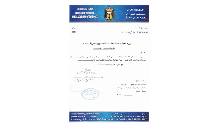 توجّه رئيس المجمع العلمي العراقي الأستاذ الدكتور عبد المجيد حمزة الناصر بالشكر والتقدير إلى الأمانة العامة للعتبة الكاظمية المقدسة/ قسم الشؤون الفكرية والإعلام، وذلك لإهدائها مجموعة من النتاجات الفكرية والثقافية والمطبوعات القيمة، خدمة للعلم والمسيرة العلمية وتحقيق أهدافها وبرامجها على الصعيد الرسالي والفكري والإنساني.