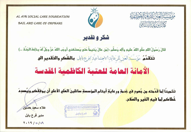 تقديراً للجهود الإنسانية التي تقوم بها الأمانة العامة للعتبة الكاظمية المقدسة ومساهمتها في تعميق ثقافة التعاون وإحياء روح التكافل الاجتماعي، والتزامها الأخلاقي تجاه الأيتام واهتمامها بذوي الشهداء، تقدّمت مؤسسة العين للرعاية الاجتماعية/ فرع بابل بالشكر والتقدير إلى الأمانة العامة للعتبة الكاظمية المقدسة، تثميناً لجهودها المباركة في خدمة ورعاية أيتام المؤسسة سائلين المولى العليّ القدير أن يوفقهم ويسدد خطاهم لما فيه الخير والصلاح.