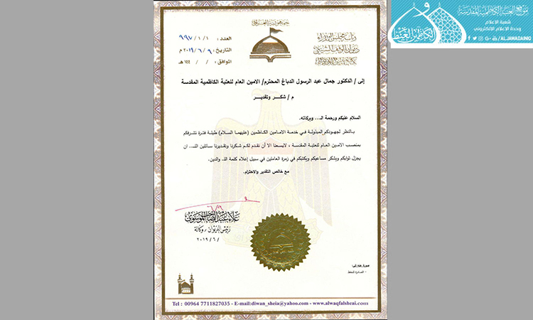 معالي رئيس ديوان الوقف الشيعي يتقدّم بالشكر والتقدير إلى الإمين السابق للعتبة الكاظمية المقدسة