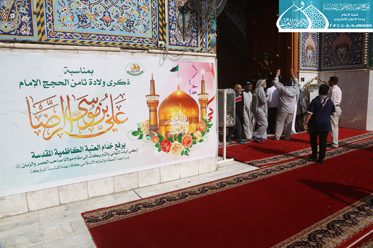 تيمناً بالذكرى المباركة لولادة ثامن الحجج الأطهار الإمام علي بن موسى الرضا "عليه السلام"، عمّت فضاءات الصحن الكاظمي الشريف بمظاهر البهجة والسرور، ونشر الكلمات النورانية في أعمدة وأواوين الطارمات استعداداً لاستقبال هذه المناسبة المباركة، والاقتداء بسيرة صاحب الذكرى العطرة "عليه السلام".