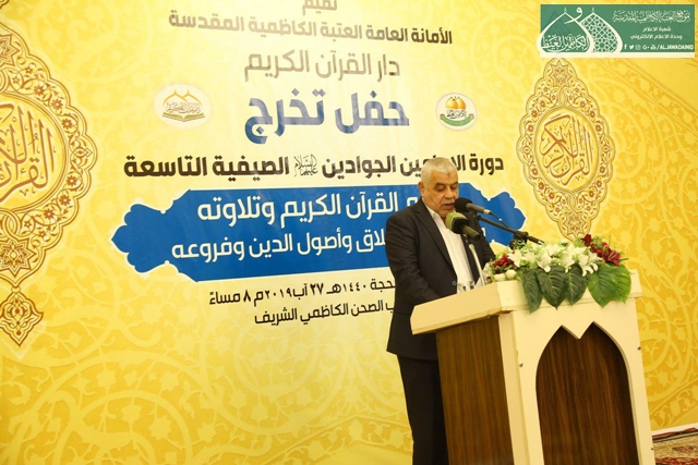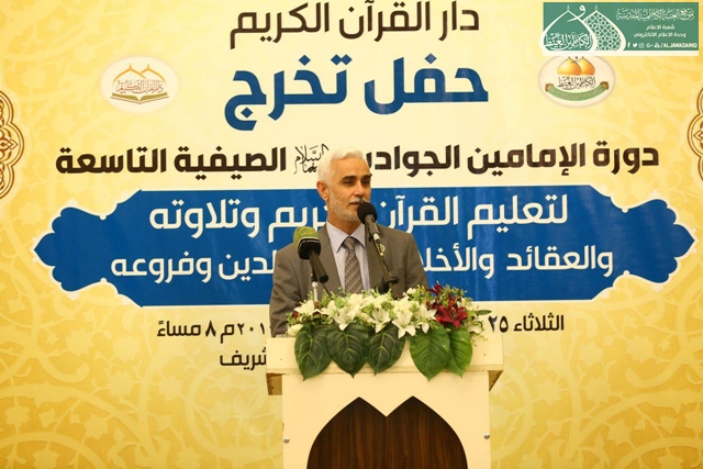 بعدها كانت كلمة لدار القرآن الكريم وألقاها السيد عبد الكريم قاسم جاء فيها: نحتفي بتخريج دفعة جديدة وثلة طيبة من أبنائنا الأعزاء من طلبة الدراسة الابتدائية والمتوسطة ومن كلا الجنسين في مواظبتهم على استكمال منهاج الدورة القرآنية الصيفية التاسعة، فينبغي هناك نتائج لهذه الجهود قد نحصل عليها من خلال تغيير سلوكياتنا وأخلاقنا وتعاملاتنا مع الآخرين، حيث أن واقعنا فيه الكثير من التحديات التي تهدد أخلاق المجتمع وسلوكياته، من خلال الاستخدام الخاطيء للتكنلوجيا الحديثة ومنها: (خدمة الانترنت، ومواقع التواصل الاجتماعي وغيرها)، التي بدأت وللأسف الشديد تؤثر سلباً على أبنائنا، وتأثر شبابنا بالثقافة المنحرفة، وترك تراثنا الإسلامي وحضارتنا التي نبعت من منهج الإسلام الصافي، فلا بد من التصدي لهذه الثقافات ونشر قيم الثقافة الإسلامية الحقيقة في المجتمع.