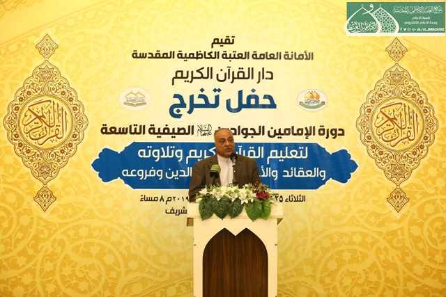 استهل الحفل بتلاوة مباركة من الذكر الحكيم من قبل الطالب محمد عدنان أحمد، تلتها كلمة العتبة الكاظمية المقدسة ألقاها أمينها العام قائلاً: (من رحاب الإمامين الجوادين "عليهما السلام"، نرحب بفلذّات القلوب .. البراعم من أتباع ومحبي النبي محمد وآله الأطهار "عليهم السلام"، أن تخرّجكم من دورة الإمامين الجوادين "عليهما السلام" القرآنية الصيفية التاسعة، وعلى يدِ أساتذة كبار أكفاء هو فرصة كبيرة ربما لم تتح لغيركم من التشرّف والتخرّج من هذه البقعة المقدسة التي احتضنت جَسَدَين طاهرين لإمامين معصومين موسى بن جعفر الكاظم ومحمد بن علي الجواد "عليهما السلام"، بل وفرصة كبيرة أن تحظوا بهذه الدورة وأنتم تتلـون كتاب الله تعالى، وتتعلمون أحكامه، وتتفقهوا في دينكم وأخلاقيات إسلامكم.