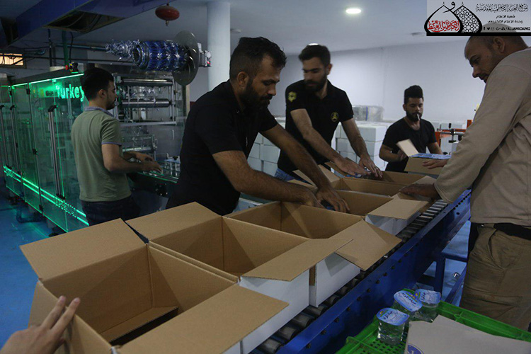 وبيّن في حديثه أن الطاقة الانتاجية في الوقت الحالي قد تصل إلى أكثر من (300) صندوق ويضم الصندوق الواحد (60) قدحاً يومياً والعدد في تصاعد مع مراعاة الجودة، وأن هذه الكميات من المياه توزع على النحو الآتي: منها لسدّ حاجة مضيف الإمامين الجوادين "عليهما السلام"، وأخرى ستوزع إلى أماكن مبيت الزائرين الكرام التابعة للعتبة المقدسة، وجزء منها سيوزع على المواكب الحسينية والجوامع والحسينيات والبيوتات المُضيّفة في مدينة الكاظمية المقدسة والمناطق المجاورة لها. كما أشار إلى أن الأمانة العامة للعتبة الكاظمية المقدسة شرعت منذ وقت مبكر بتجهيز المعمل بالمواد الأولية من الكارتون، وعبوات الأقداح والأغلفة المصنوعة من مادة الألمنيوم.