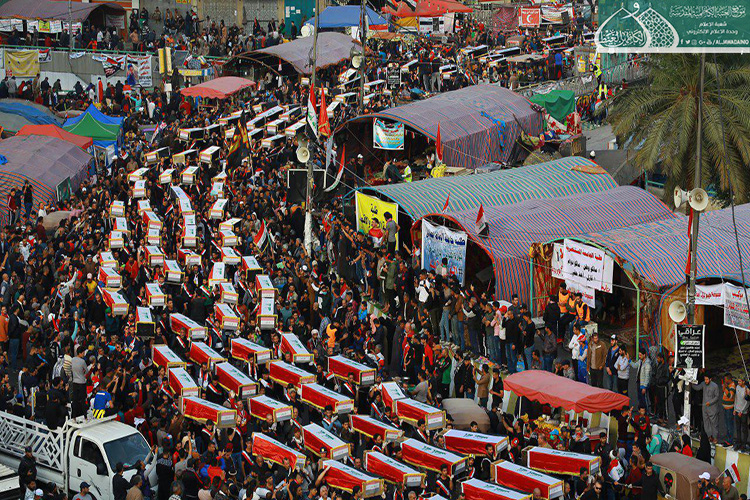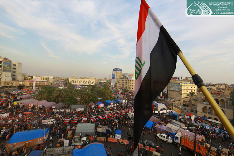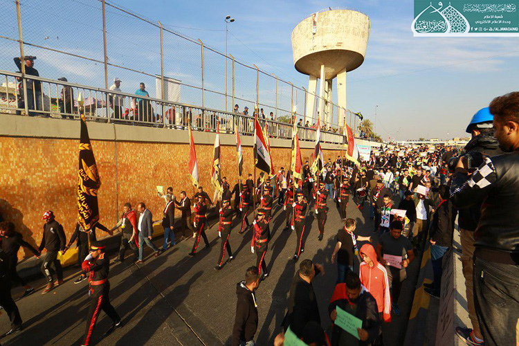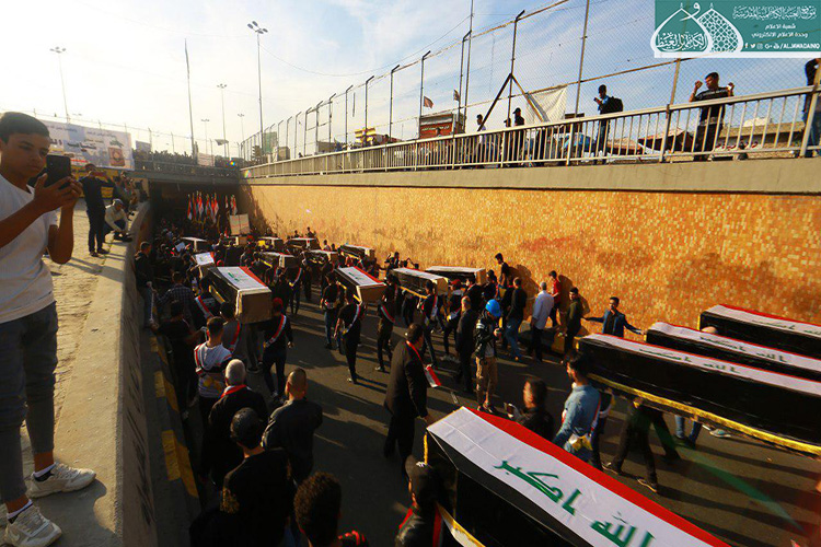 إكراماً للدماء الطاهرة التي نزفت في دروب التضحية والولاء والفداء ليرتقوا سُلّم المجد والشهادة والخلود من أجل العراق، الذين عقدوا العزم لبذل أرواحهم ومهجهم لإعلاء كلمة الحقّ والمطالبة بحقوقهم المشروعة التي كفلها الدستور، وبتوجيه من قبل الأمين العام للعتبة الكاظمية المقدسة الأستاذ الدكتور حيدر حسن الشمّري لدعم معركة الإصلاح الوطنية التي نادت بها المرجعية الدينية العُليا متمثلة بسماحة آية الله العظمى السيد علي الحسيني السيستاني "دام ظله الوارف"، شارك كوكبة من خدّام الإمامين الكاظمين الجوادين "عليهما السلام" مع إخوانهم في العتبة العسكرية المقدسة بالمسيرة التأبينية والتَشييع الرمزي لشهداء المظاهرات السلمية والاحتجاجات الشعبية التي شهدتها ساحة التحرير بالعاصمة بغداد حاملين رايات العراق، والراية المباركة للإمامين الكاظمين الجوادين "عليهما السلام"، حيث صَدحت حناجرهم بعبارات الحزن والمواساة، وانتهت تلك المسيرة بوقفةٌ احتجاجية طالبت بالتزام التوصيات والتوجيهات التي أكدت عليها المرجعية العُليا في النجف الأشرف في الحفاظ على سلمية التظاهرات، وتحقيق مطالب الشعب العراقي وطموحاتهم المشروعة وعدم تسويفها، وتحقيق الإصلاح في جميع مفاصل المنظومة الحكومية.