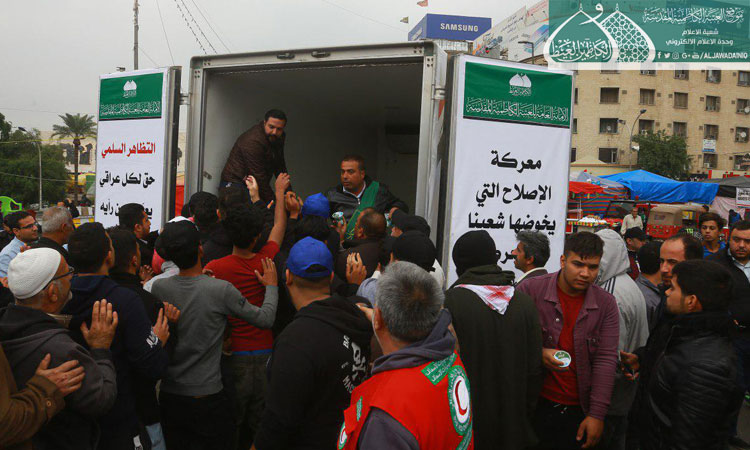 حيث يوفّر مضيف الإمامين الجوادين "عليهما السلام" التابع لقسم العلاقات العامة وجبات الطعام لتوزيعها على المتظاهرين السلميّين، فضلاً عن تجهيز كميات كبيرة من مياه المراد الصحية، والخدمات المختلفة.