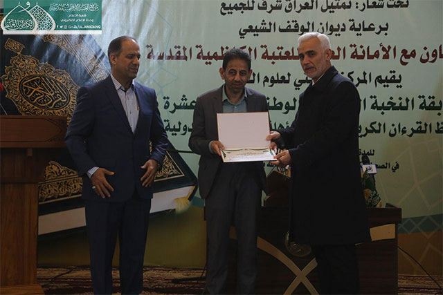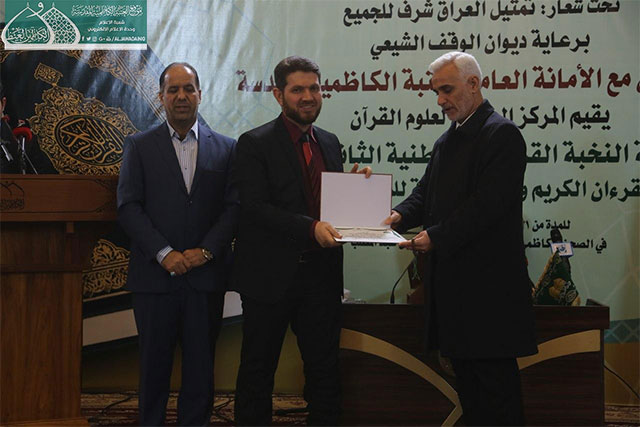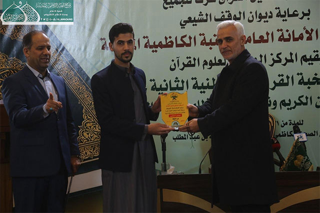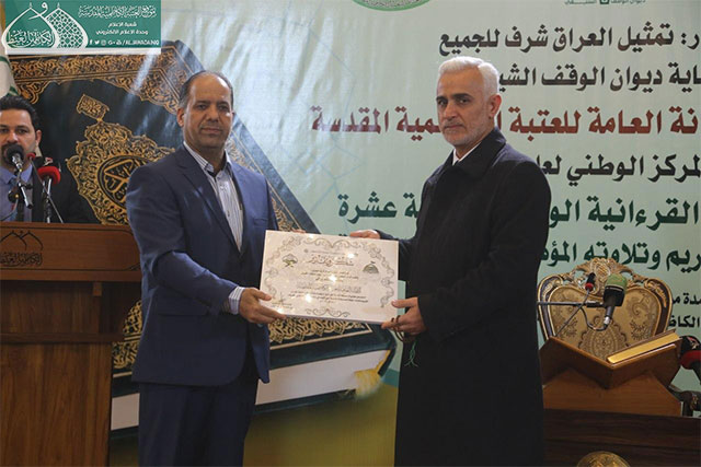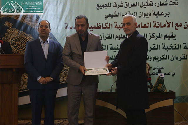 وفي ختام المسابقة قدّم مدير المركز الوطني لعلوم القرآن الكريم هدية تذكارية إلى الأمين العام للعتبة الكاظمية المقدسة، وتوزيع الدروع والشهادات التقديرية إلى أعضاء اللجنة التحكيمية واللجان التنظيمية والحفّاظ والقرّاء الفائزين الذين صدحت حناجرهم وجادت قرائحهم بتلاوات مباركة من الذكر المجيد والذين سيمثلون العراق في المحافل والمسابقات الدولية.