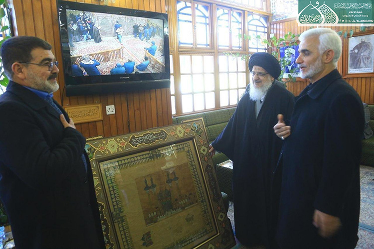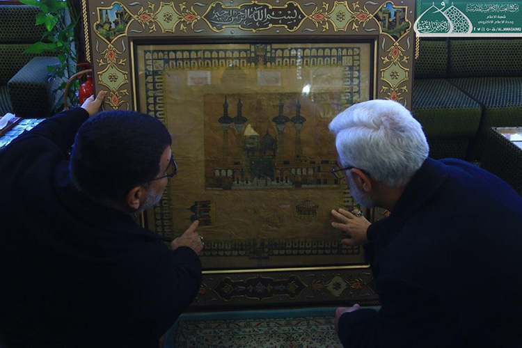 وشهد اللقاء تقديم الحاج مقداد السعد، لوحة فنية نادرة قيّمة وثمينة كهدية للعتبة الكاظمية المقدسة إلى مقام الإمامين الكاظمين الجوادين "عليهما السلام"، معبراً خلال حديثه عن حبّه وولائه وتعلّقه بهذا المقام الطاهر الذي لا يُقدّر بثمن ولا يُقاس بأنفس وأثمن الهدايا، كما قدّم شرحاً موجزاً عن اللوحة وقيمتها الفنية والرمزية والأثرية والتي تمثل جزءاً مهما من التراث الديني والحضاري حيث صورت أهم معالم الهندسة المعمارية للصحن الكاظمي الشريف والتي يعود تأريخها إلى زمن فرهاد ميرزا القاجاري.