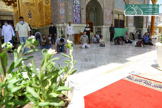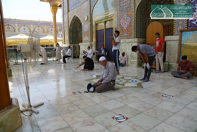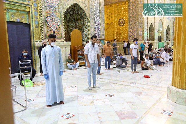 الأمانة العامة للعتبة الكاظمية المقدسة تحقق التباعد الصحي الوقائي من خلال تحديد أماكن وقوف المصلين