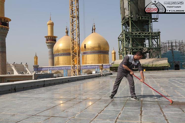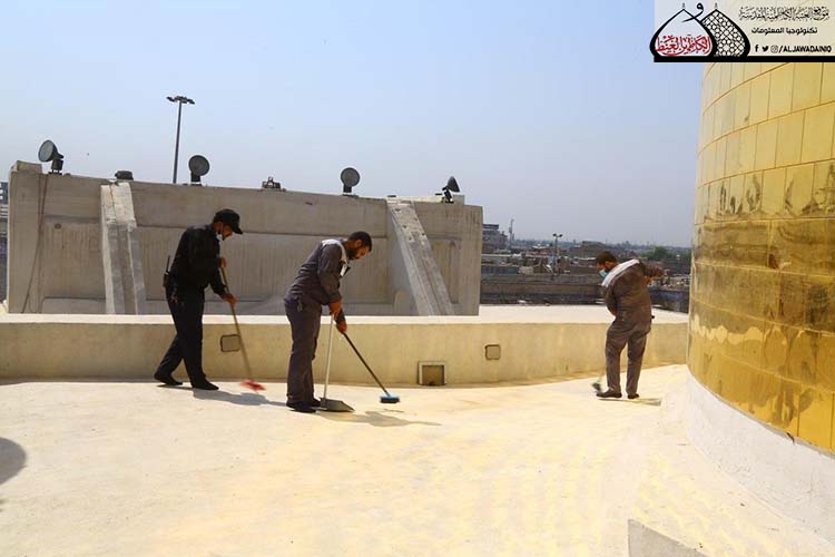 خدّام الإمامين الكاظمين الجوادين "عليهما السلام" يقومون بأعمال تنظيف وإدامة أسطح الحرم الشريف