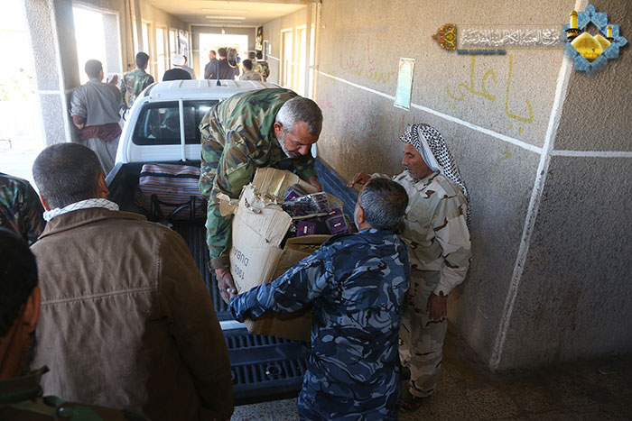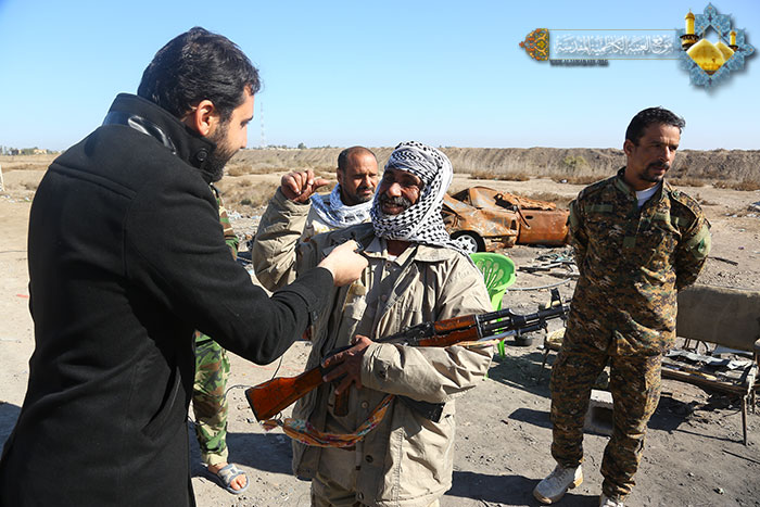 زار وفد مشترك من خَدَمَة العتبتين المقدستين العلوية والكاظمية وبرفقته مجموعة من السادة والشيوخ الفضلاء في الحوزة العلمية بالنجف الأشرف قواطع العمليات العسكرية في منطقة الضابطية وبنات الحسن المحاذية لشمال بغداد والواقعة ضمن الحدود الإدارية لمحافظة الانبار. والتقى الوفد أمراء تشكيلات مجاهدي الحشد الشعبي الذين لبوا نداء المرجعية العليا المتمثلة بسماحة آية الله العظمى السيد علي الحسيني السيستاني "دام ظله الوارف"، كما اطلع على الوضع الأمني الذي تشهده تلك المناطق. وأشاد الوفد الزائر بالجهود المباركة والمواقف النبيلة والشجاعة المتميزة لهؤلاء الجنود الأبطال الذين سطروا أروع صور التضحية من أجل تحرير هذه الأراضي العراقية من دنس الإرهاب التكفيري. وساهم وفد العتبة الكاظمية في دعم وإسناد تلك القطعات من الحشد الشعبي وتقديم المواد العينية لهم. وفي ختام الزيارة نقل الوفد تحيات الأمانة العامة للعتبة الكاظمية المقدسة المتمثلة بأمينها العام أ . د "جمال الدباغ" وأعضاء مجلس الإدارة وخدمة الإمامين الجوادين داعين الله تبارك وتعالى أن يسدد خطاهم ويجعل النصر على أعداء الإنسانية على أيديهم إنه سميع مجيب.